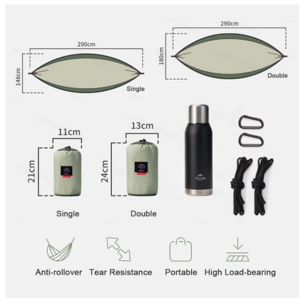 Hammock dari Naturehike dengan bahan 340T Pongee yang lembut dan kuat, bisa menahan beban sampai +/- 400kg. High density braided rope yang dapat mencegah hammock tergulung saat dipakai. Hammock ini sangat ringan (ultralight) dengan berat hanya 600-690gr)