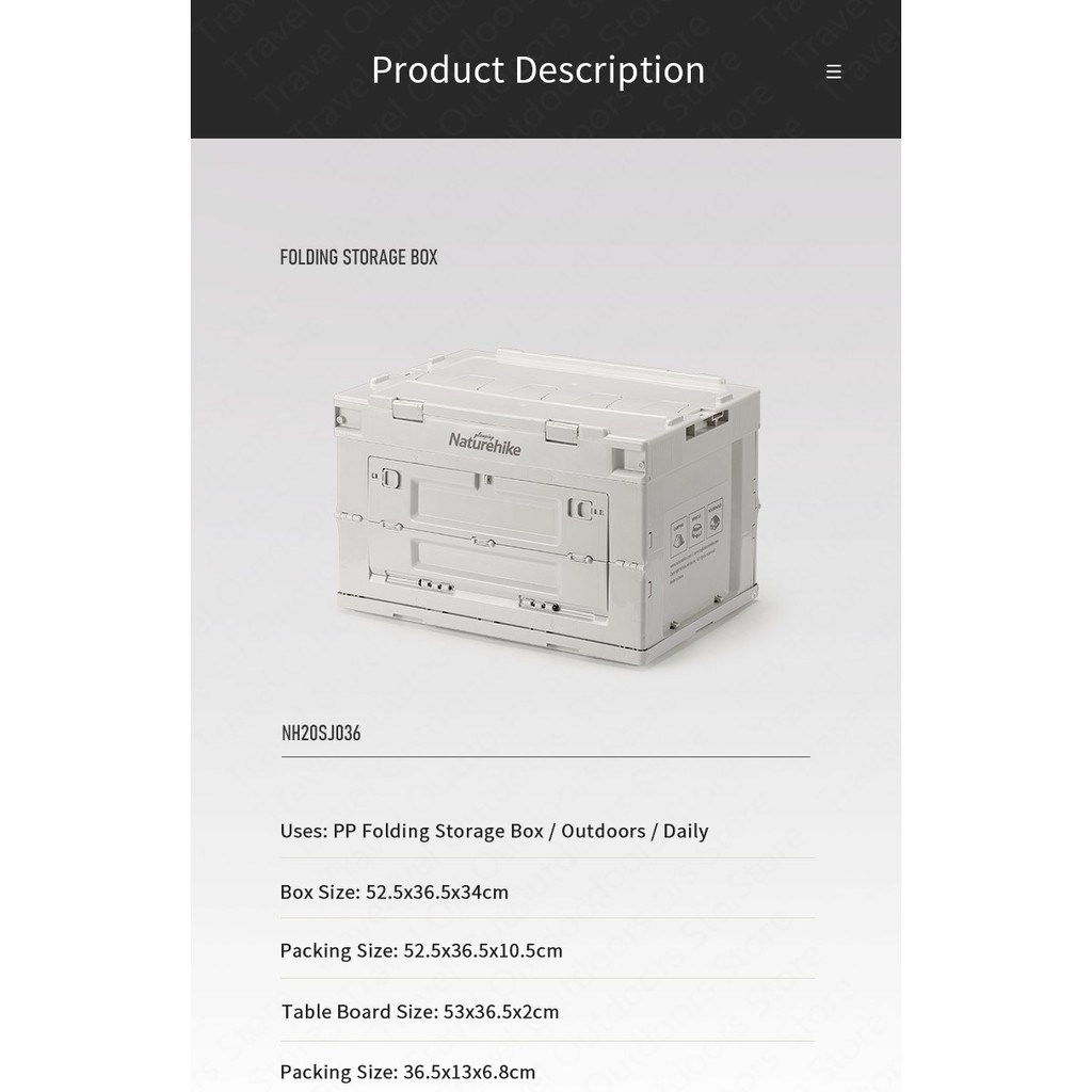 Kotak penyimpanan lipat serbaguna berkapasitas 80L dari Naturehike, berbahan PP material yang kuat dan kokoh. Desain lipat yang membuat storage box ini compact dan tidak makan tempat. Box memiliki ketahanan beban diatasnya sampai 60kg dan ketahanan beban barang bawaan dapat mencapai 20kg